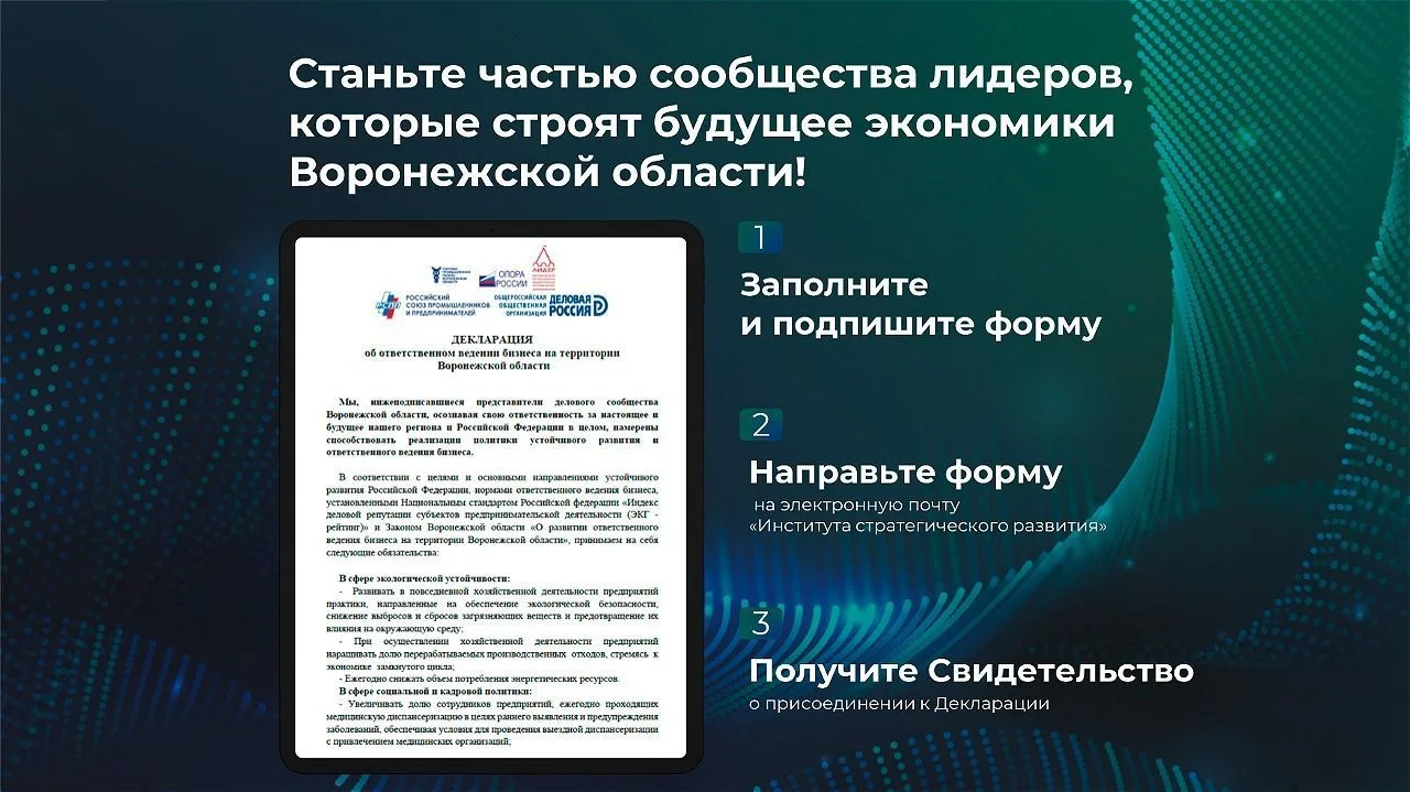 Чтобы присоединиться к Декларации, необходимо перейти по ссылке, заполнить и подписать форму и направить её на электронную почту АУ ВО «Институт стратегического развития»: inst.region@govvrn.ru.